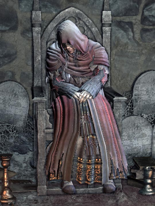 The handmaiden to The Firekeeper, she is responsible for keeping the kindled undead who travel through Firelink Shrine stocked with supplies. Ultimately she is quite helpful despite her eerie vibes.